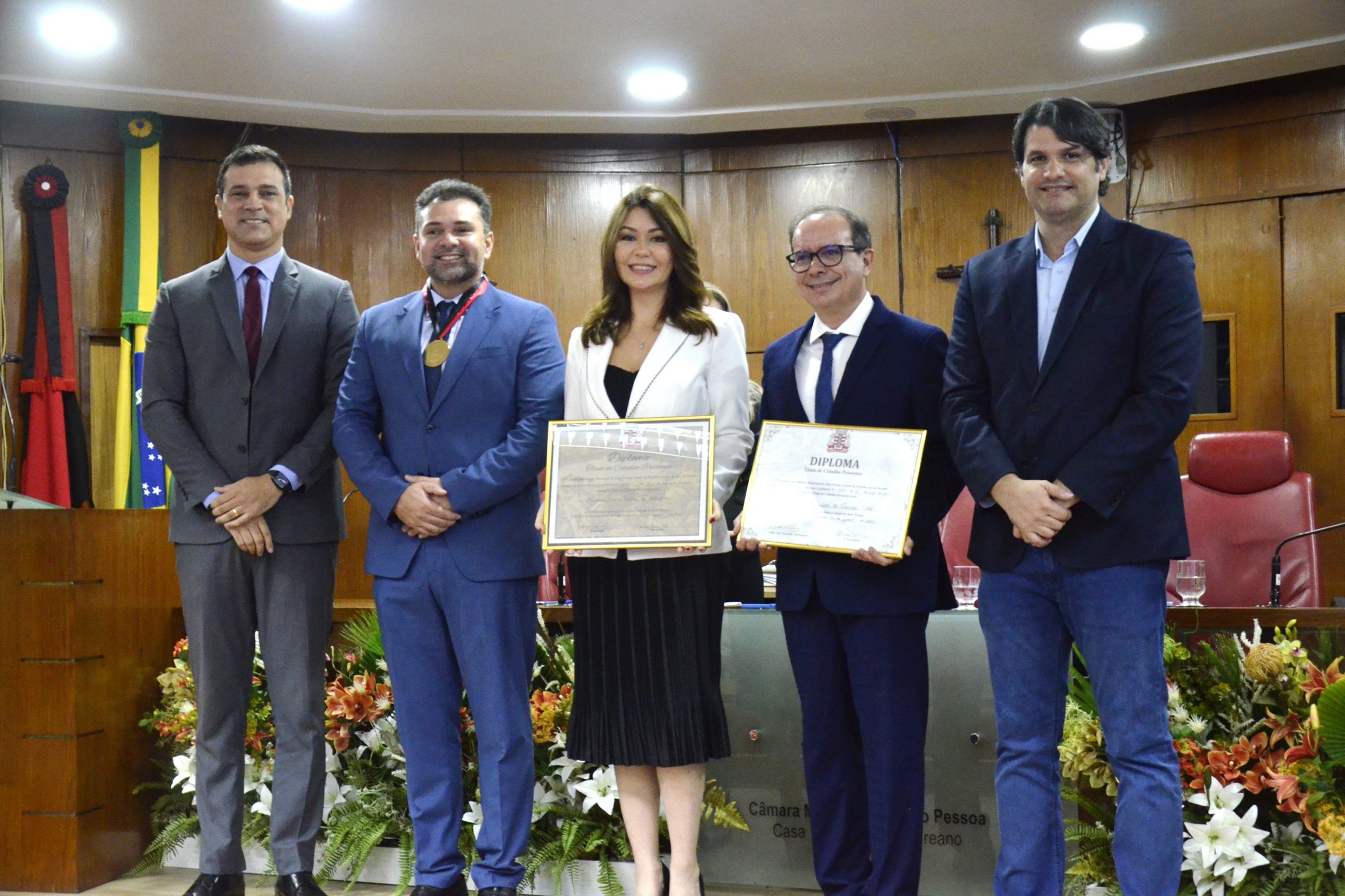 Foi realizada na tarde desta segunda-feira (05) na Câmara Municipal de João Pessoa (CMJP), a sessão solene de entrega dos títulos de cidadania pessoense aos médicos Narriane Chaves Pereira e Antônio Henriques de França Neto e a Medalha Cidade de João Pessoa ao médico Bruno Leandro de Souza. A propositura da sessão foi do então vereador e hoje vice-prefeito de João Pessoa, Leo Bezerra (PSB).