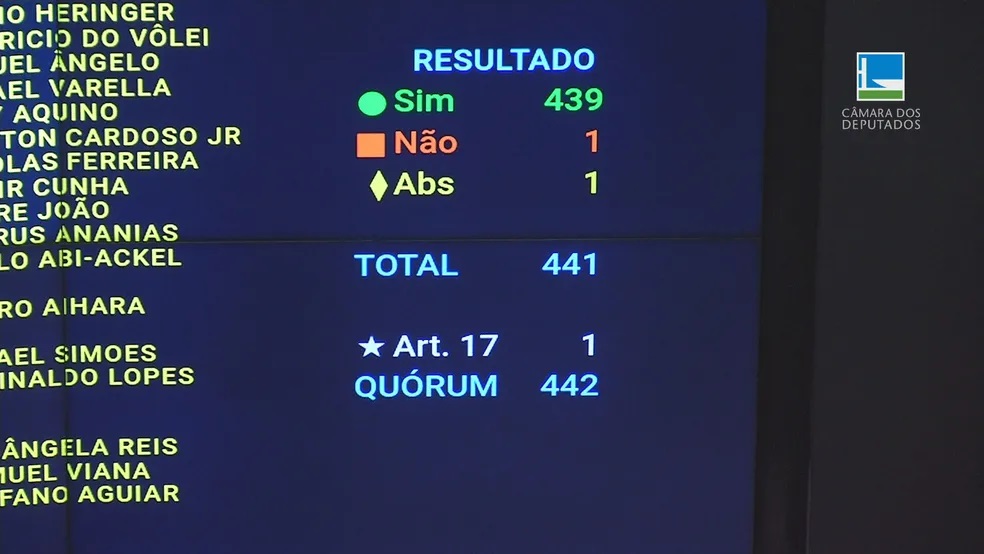 O placar foi de 439 votos favoráveis e 1 contrário, do deputado Luiz Lima (PL-RJ). Logo em seguida, ele disse que votou errado.