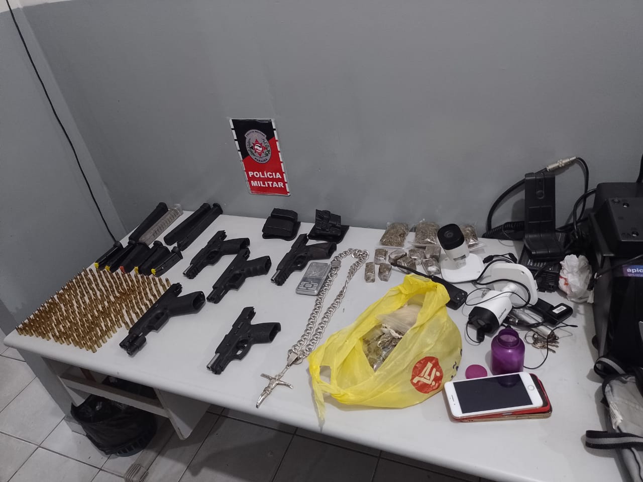Na ação, com o grupo criminoso foram apreendidos: 5 pistolas; calibre 9 mm; 10 carregadores; 204 munições de 9 mm; aproximadamente 1 mil reais, em espécie; 2 gandolas do exército; 3 coletes balísticos; 1 par de coturno militar; 1 balaclava; 27 pedras de crack; 4 porções de cocaína; 19 comprimidos de êxtase; 17 porções de haxixe; 3 pacotes, 12 porções de maconha e 108 papelotes de maconha; 1 balança de precisão; 1 rádio comunicador; um coldre em polímero; um porta-carregador; 2 câmeras de monitoramento; e vários celulares.