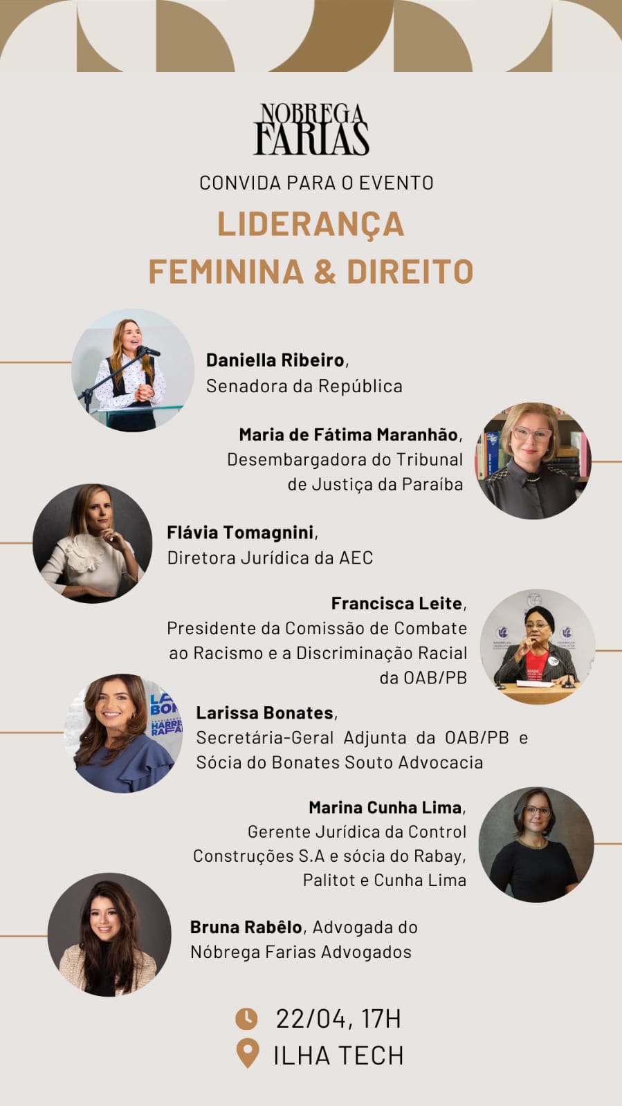 Este encontro singular contará com a presença de mulheres ilustres, como a senadora da República pela Paraíba Daniella Ribeiro, conhecida por sua atuação decisiva no legislativo brasileiro; Maria de Fátima Maranhão, desembargadora do Tribunal de Justiça da Paraíba; Flávia Tomagnini, diretora jurídica e de compliance da AeC; Francisca Leite, presidente da comissão de combate ao racismo e a discriminação racial da OAB-PB; Larissa Bonates, secretária geral adjunta da OAB-PB e sócia do Bonates Souto Advocacia; Marina Cunha Lima, gerente jurídica da Control Construções; e Bruna Rabêlo, advogada do Nóbrega Farias Advogados. Essas líderes trarão suas perspectivas valiosas, histórias de sucesso e os desafios superados em um campo ainda dominado por figuras masculinas.