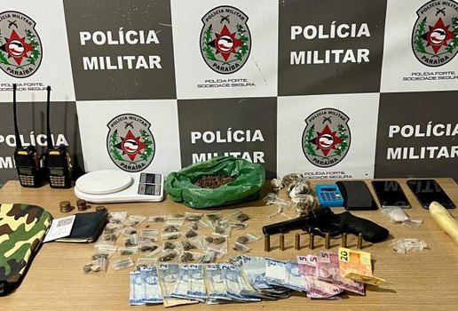 Com ele, foram apreendidos maconha, crack, um revólver calibre 38, radiocomunicadores, celulares, balança, maquineta de cartão, balaclava e dinheiro.