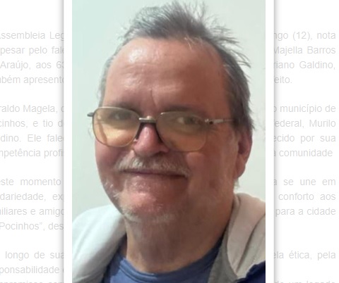 A Assembleia Legislativa da Paraíba (ALPB) emitiu, neste domingo (12), nota de pesar pelo falecimento do professor e engenheiro, Geraldo Majella Barros de Araújo, aos 63 anos. O presidente da ALPB, deputado Adriano Galdino, também apresentou um voto de pesar pelo falecimento do ex-prefeito.