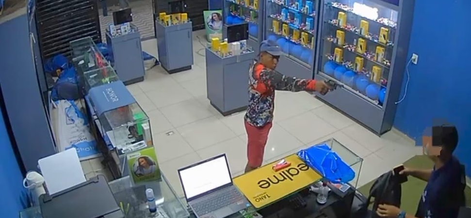 Um homem armado invadiu e assaltou uma loja de celulares no bairro de Mangabeira, em João Pessoa, na noite desta sexta-feira (10). O crime foi registrado por câmeras de segurança, que mostram toda a ação.