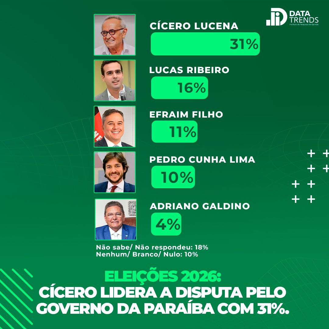 No levantamento, Cícero Lucena lidera com 31% das intenções de voto, seguido por Lucas Ribeiro (16%), Efraim Filho (11%), Pedro Cunha Lima (10%) e Adriano Galdino (4%). Outros 18% afirmaram que não votariam em nenhum dos nomes apresentados, enquanto 10% não souberam responder.