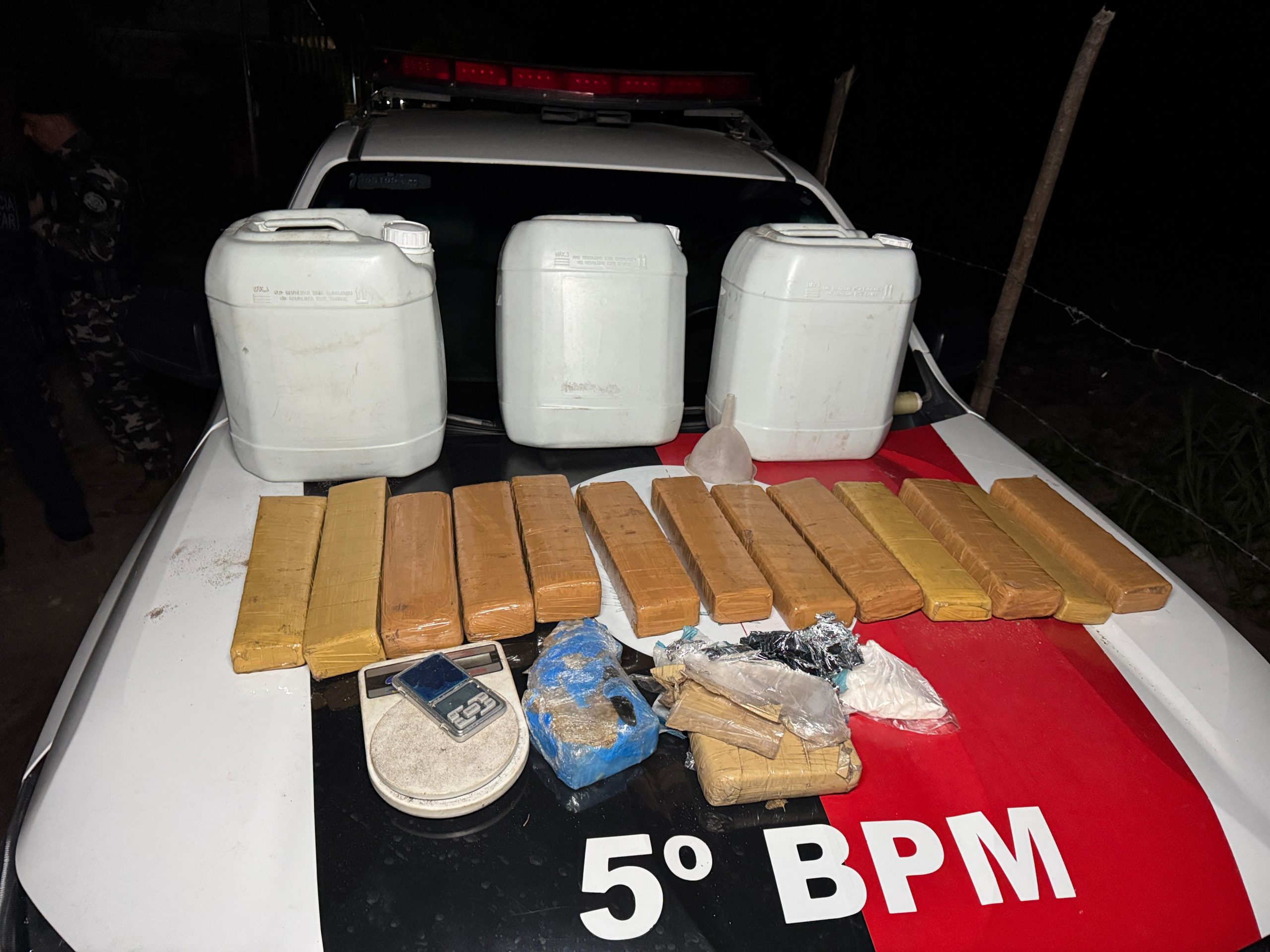 A apreensão foi realizada durante incursão da Força Tática do 5º Batalhão, com apoio do Comando-Geral da PM. Nenhum suspeito foi localizado, e as buscas seguem na região durante todo o fim de semana.